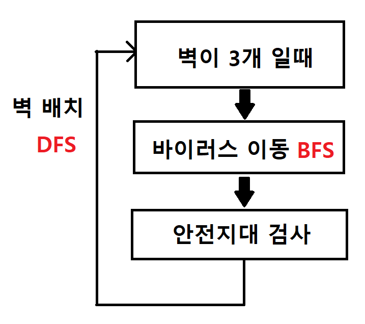 인체에 치명적인 바이러스를 연구하던 연구소에서 바이러스가 유출되었다. 다행히 바이러스는 아직 퍼지지 않았고, 바이러스의 확산을 막기 위해서 연구소에 벽을 세우려고 한다. 연구소는 크기가 N×M인 직사각형으로 나타낼 수 있으며, 직사각형은 1×1 크기의 정사각형으로 나누어져 있다. 연구소는 빈 칸, 벽으로 이루어져 있으며, 벽은 칸 하나를 가득 차지한다. 일부 칸은 바이러스가 존재하며, 이 바이러스는 상하좌우로 인접한 빈 칸으로 모두 퍼져나갈 수 있다.